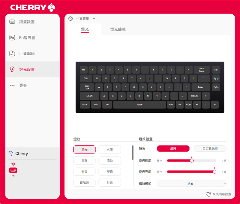 RGB 燈效提供流光、水波、正弦波、彩泉等多種模式可以挑選,如果你有偏好的顏色或閃爍速度,也都能在這邊細調。除此之外,懶得開設定介面的話,直接透過鍵盤上的 Fn 快捷鍵也能快速切換燈效唷!