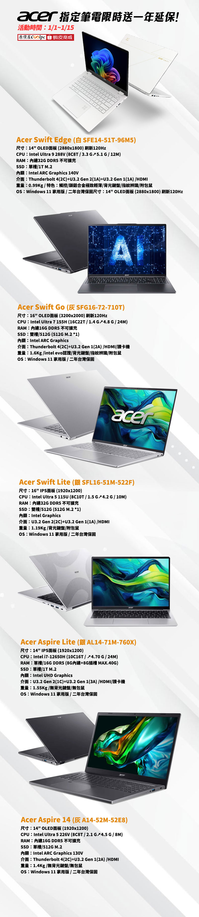 最近電腦圈最常聽到的一句話是什麼?不是什麼效能爆表,而是記憶體又要漲價了… 眼看各品牌的筆電價格準備一起往上調,還在觀望的你是不是都有點手抖了?別擔心,先幫你踩煞車!這一波不跟你談漲價的事,我們改談「安心」好了。1/1~1/15,只要來原價屋購買指定的 Acer 筆電(不含 Predator 與 Nitro 系列),原價屋就加碼!加送你一年的延長保固。等於直接把筆電的安心使用期限再拉長一年~維修、料件、工時通通免費!這種補血方式,真的比升級還實在啦~先說重點,這延長保固是實打實的保障!在延長保固期間內,只要是正常使用下的硬體故障,包含零件更換與維修工時,通通都幫你負責處理,讓你不用每次開機怪聲音一出現,就馬上開始上網搜尋「維修要多少錢?」。那 Acer 這些指定機種到底適合誰呢?不管你是每天帶著筆電通勤的上班族、追劇剪片兩邊跑的創作者,還是需要穩定效能的學生族,Acer 在輕薄設計、續航表現與整體耐用度上,一直都是「低調但很能打」的代表。鍵盤好打、散熱穩定、效能配置又實在,再加上這次原價屋直接幫你延保,等於把長期使用的風險一次處理好!這麼棒的筆電品牌不買嗎?這麼貼心的店家不來嗎?趕緊看好活動期限,來原價屋選一台吧!