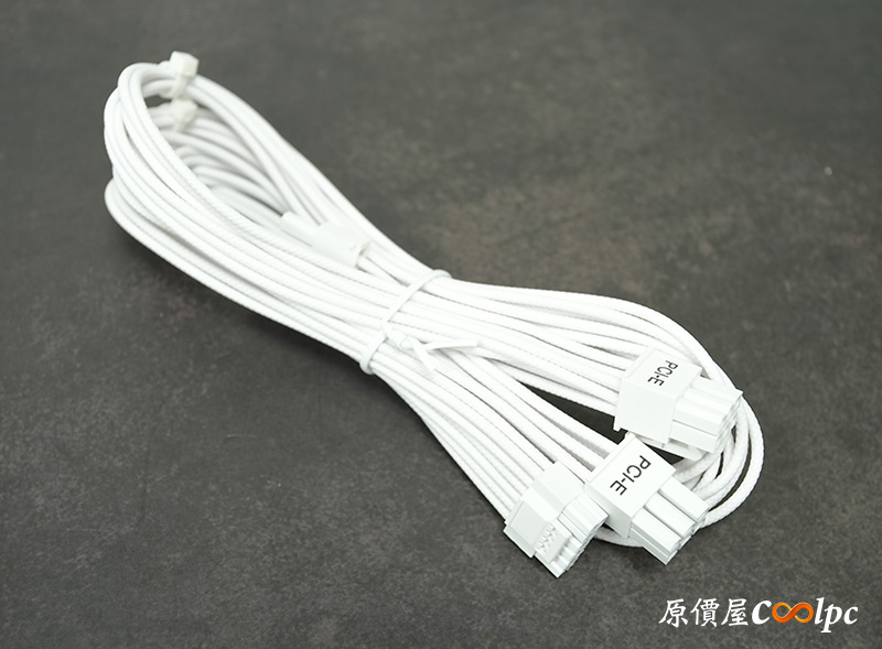 全模組化的線材一覽,有主機板MainBoard 24Pin,兩條CPU 4+4Pin為主機板超頻提供更穩定的供電,12V-2×6是高階RTX顯卡的16Pin供電,傳統顯卡的PCIe 6+2Pin也沒少,SATA和Molex則做在同一條。