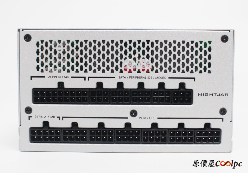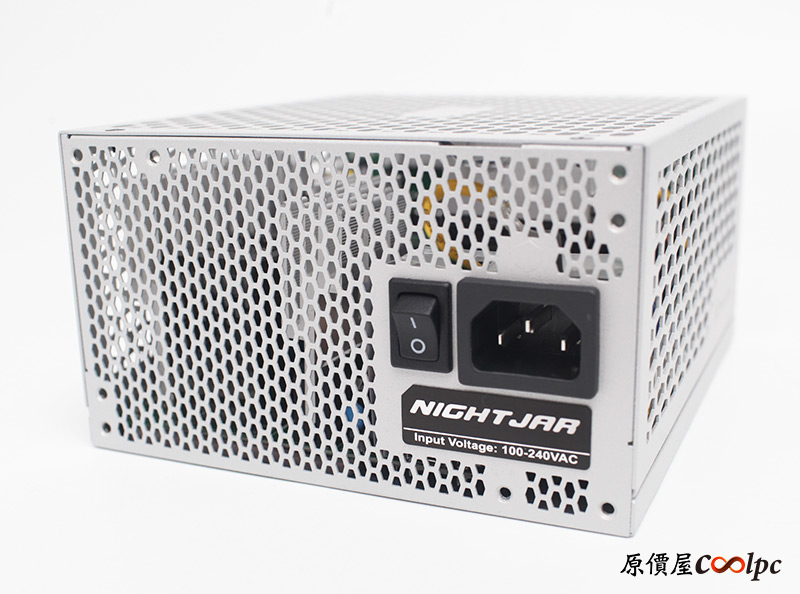電源屁股有連接交流電的插孔、電源翹板開關,下方做了一個寫著NIGHTJAR以及輸入電壓100-240VAC的銘牌。這面同樣有開孔,不過孔洞方向和其他面稍有不同,洞的尺寸也相對較小。