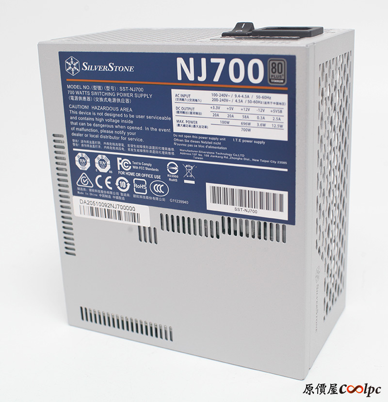 NJ700支援100-240V電壓輸入,9.4-4.5A電流輸入,在+3.3V/+5V時可輸出20A 100W,+5VSB 時可輸出2.5A 12.5W,+12V 時有高達58A 696W輸出,最大總功率700W。
