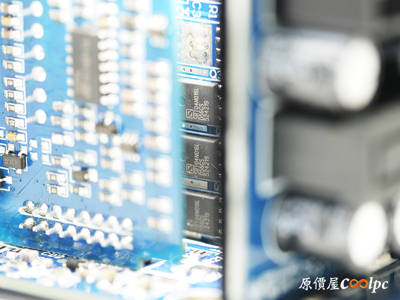 直接看模組化輸出端這邊,插槽功能都有標示加上防呆設計,看得出來12V-2×6有預留一個插槽空間,但猜測是因為這顆LEADEX III最多就850W輸出,多做也不會真的讓總輸出上升,看來只有更大瓦數的版本有機會用上它了。