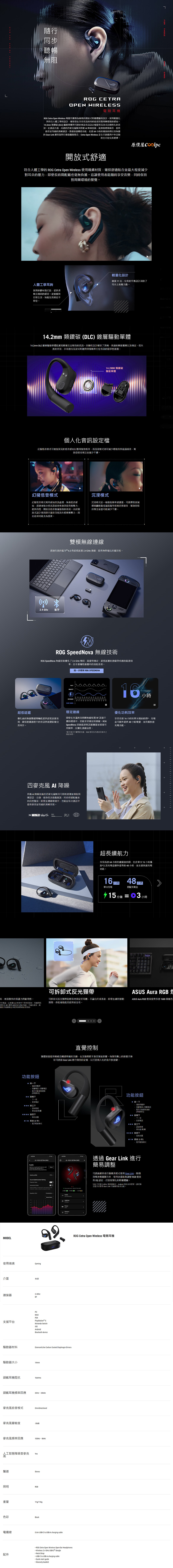 無論哪種類型的耳機,我認為舒適始終最重要,否則音質性能再好可能都戴不住!新上市的華碩ROG CETRA OPEN WIRELESS耳機就完美解決這個問題,採用開放式人體工學掛耳設計,少了傳統入耳式耳機的悶熱與擠壓感,加上11g輕量化與親膚材質最大程度減少對耳朵的壓力,長時間配戴也無負擔,而且開放式設計較能感知周遭環境,安全性都更高一些。內建14.2mm類鑽碳(DLC)鍍層驅動單體確保音效清晰、低失真,搭配幻擬低音模式增強低音表現,沉浸模式減少背景噪音干擾,雙模藍牙6.0、超低延遲2.4GHz無線連接,ROG SpeedNova優化2.4GHz頻段,四麥克風AI降噪,單次充電16小時+充電盒48小時超長續航力!耳機本身還符合IPX5防潑水等級,附上可拆式反光頸帶提高使用安全性,還有1680萬種Aura RGB燈效變化,透過實體功能按鈕直覺控制,或是Gear Link網頁or APP調整設定。新品上市期間到原價屋買ROG CETRA OPEN WIRELESS無線耳機,就可以額外獲得一個ROG CARD HOLDER信仰證件套,數量有限送完為止喔。