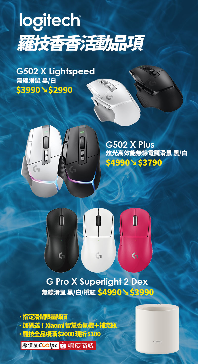 這次活動指定滑鼠提前瘋搶!可說是性能、手感、價格三連爆啊!每一款都是玩家群裡的熱門型號… 而且是全員降價啊!「G502 X Lightspeed」這款本來就被稱為「多工型玩家神兵」,配上 LIGHTSPEED 無線低延遲、HERO25K 感應器、LIGHTFORCE 微動,不論你是在遊戲裡狂點還是辦公室狂拚,操控都又快又穩。現在黑、白兩色直接從 $3990 變 $2990!「G502 X PLUS」則是 RGB 亮到提前慶祝雙 12!搭載 LIGHTSYNC RGB,讓你桌面發光體驗絕佳氣氛!HERO25K 感應器+LIGHTSPEED 無線,效能與視覺一次拉滿~這款提前入手才是真正對味。一樣黑白兩色直接從 $4990 降到 $3790!「G Pro X Superlight 2 Dex」想要變強就靠這支!僅約 60g 的超輕量,搭配次世代 HERO2 感應器與 LIGHTSPEED 無線技術,滑起來就是「預判級手感模式」。現在黑、白、桃紅三色全都 $4990 變 $3990。而且現在入手這幾支滑鼠還有免費的「Xiaomi 智慧香氛機+補充瓶」可以拿~也就是你買滑鼠,連房間也開始一起香了!除了滑鼠升級,現在連氣味都改善了。妹子也會想到妳房間來一同遊戲~好啦,這檔是不是很香很迷人啊~快快手速啊!