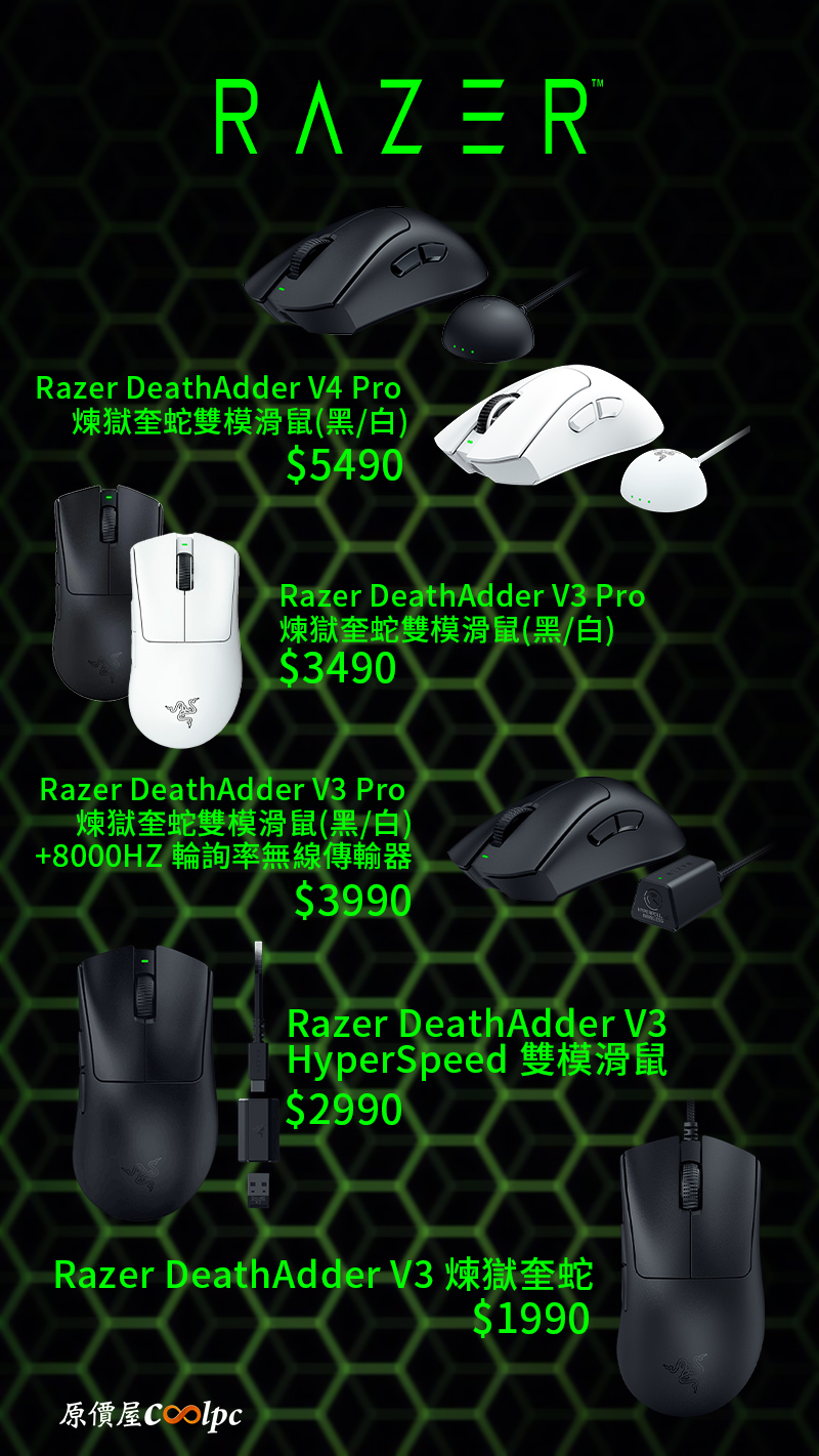 Razer DeathAdder V3 HyperSpeed 雙模滑鼠/有線-無線/26000Dpi/55g, $2990 (蝦皮