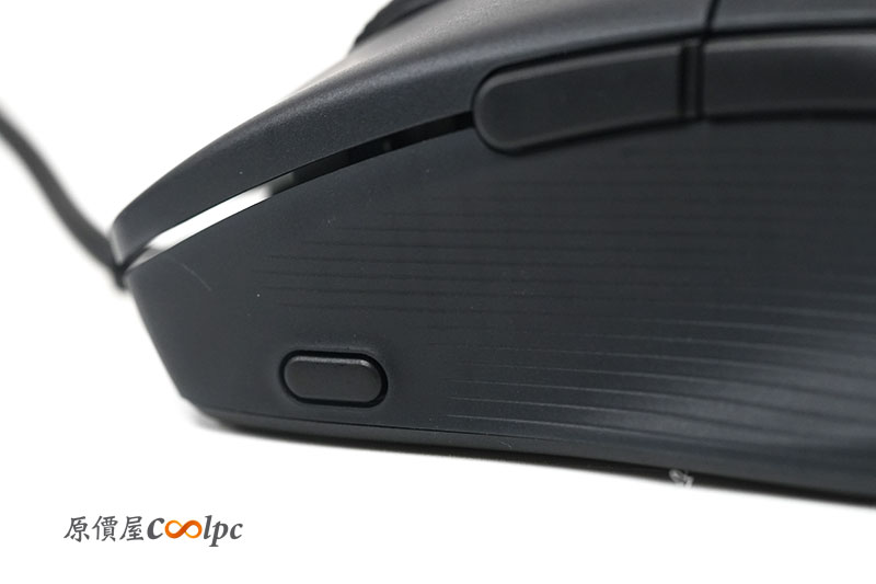 而滑鼠的 DPI 檔位調整,也是設計在滑鼠左側偏鼠頭的位置,這次相對少見的設計喔。
