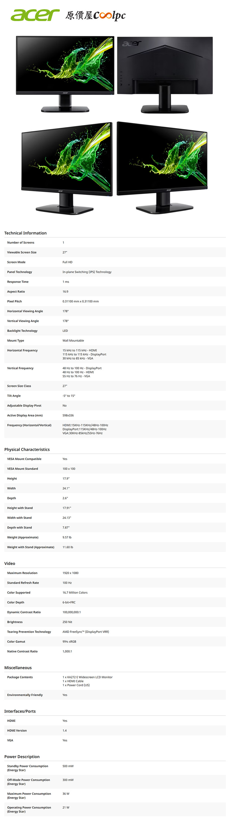 ACER KA272 Ebi〈1A1H/IPS/100Hz〉, $2699↘$2288 (蝦皮運費另計+$200)