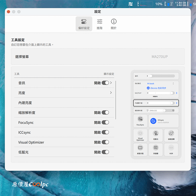 DisplayPolot 2 軟體安裝好,控制介面跟手機快捷非常像,沒有弄得很複雜,簡單明瞭。想要跟螢幕同步顏色,務必打開 M-book 模式,有一個 iDevice 色彩同步,會自動抓取電腦的版本,若錯誤可以再進去挑選自己的Macbook 型號;同步之後你要停整音量跟螢幕亮度都可以透過鍵盤或軟體來操作。