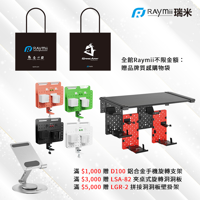 即日起到 3/31,入手 Raymii 瑞米全系列支架,原價屋全台門市及蝦皮商場同步開啟浪漫滿額贈!只要下單就送品牌質感購物袋;消費滿 $1,000,送市價 $349 的 D100 鋁合金旋轉支架,讓你們的情話與影片隨時隨地靈活轉動;滿 $3,000 送市價 $999 的 LSA-82 夾桌式旋轉洞洞板,把告白的小物與耳機通通收納整齊。如果你們是追求極致桌搭的神仙眷侶,滿 $5,000 就把市價 $1,799 的 LGR-2 拼接洞洞板壁掛架帶回家!贈品全是限量供應,送完為止唷!