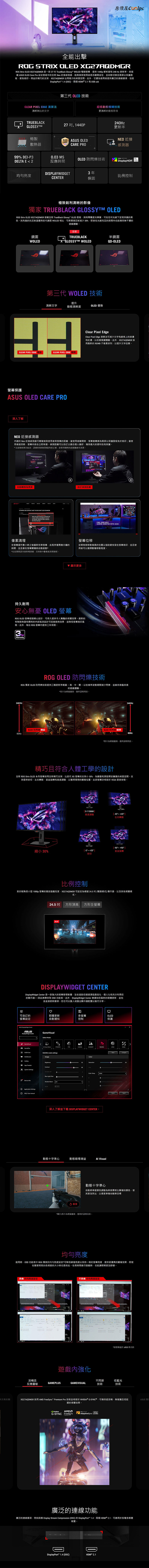 華碩 ROG Strix XG27AQDMGR 則是 WOLED TrueBlack Glossy 2K 解析度面板,配上零霧度光學層,可將環境反射減少 38%,在任何光線下呈現深邃的黑,因面板採 RGWB 子像素排列,透過 Clear Pixel Edge 演算法,可以減少邊緣色散,獲得更好的視覺體驗。規格部分同樣 0.03ms(GTG) 反應時間、99% DCI-P3 廣色域、△E< 2 色彩準確度,支援 FreeSync Premium Pro & G-SYNC Compatible 防撕裂技術,也有 ROG Gaming A.I 輔助功能 和 ASUS OLED Care Pro 功能。
