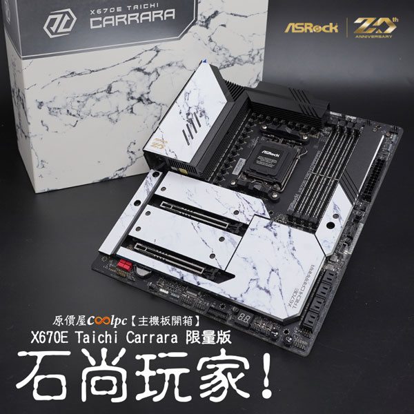 ASRock X670E Taichi Carrara這張主機板是慶祝華擎滿20週年推出的特別版,外盒就可以看到滿滿的卡拉拉大理石花紋,說真的還蠻好看的!這張是給AMD Ryzen 7000系列處理器使用。