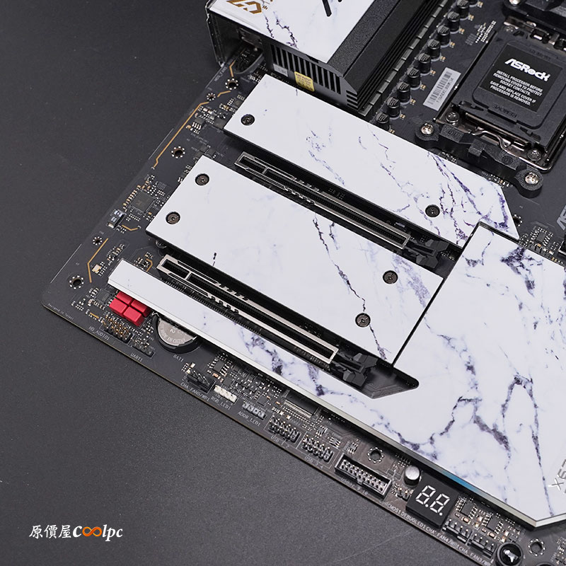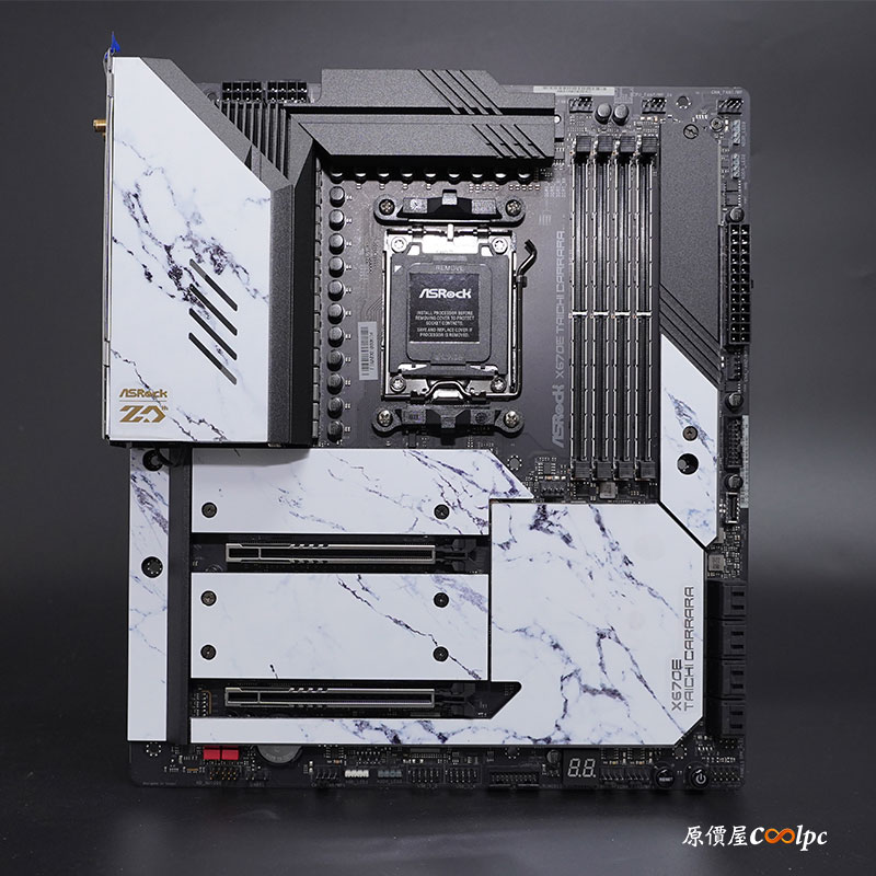 ASRock X670E Taichi Carrara主機板現身啦!主機板為8層板E-ATX尺寸規格,大理石的花紋佔了主機板3/2的面積,底下都是厚實的散熱片,而左上的I/O的MOSFET散熱模組內還有一顆小風扇加速鋁製散熱片散熱,記憶體和PCIe介面插槽都有強化裝甲設計,據說是表面黏著技術,不僅強化金屬針腳物理強度,還能增強線路的訊號,讓記憶體和PCIe插槽訊號有更穩定的品質。