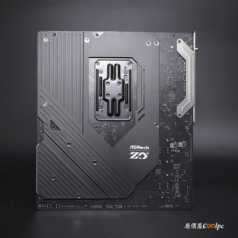 厚實的散熱片拆下來,可以看到裡面散熱片內還有一根導管連結VRAM和PCH晶片,透過散熱片內的風扇來加速散熱。供電相數為24+2+1相超嚇人的數目…,PWM控制器為Renesas RAA229628,MOSFET為Renesas RAA22010540和Sic431A,前者每相提供105安培的電流,後者60安培電流,搭配上數顆Nichicon黑色固態電容和電感,確保Ryzen9 7950X處理器有穩定和足夠的電力,網路晶片為Intel Killer E3100、USB3.2 Gen2 10Gb/s 晶片為PI3EQX1004ZHE、USB4/Thuderbolt 4晶片為intel JHL8540、Type-C PD供電為Realtek 5452E、音效部分為Realtek ALC4082晶片和ESS SABRE9218 DAC以及WIMA 音效電容組成,兩顆南橋晶片上方的處理部分USB、M.2、SATA以及音效卡、有線、無線網路,下方的則是處理部分USB和M.2、SATA,M2_1上方還有一顆 Renesas RC26008 外部時脈晶片,可以讓CPU超頻更有潛力釋放更多效能,PCIe插槽下還有8科PCIe 5.0 Redriver晶片,Wi-Fi 6E晶片為Intel Killer 1675x(AX210NGW)。