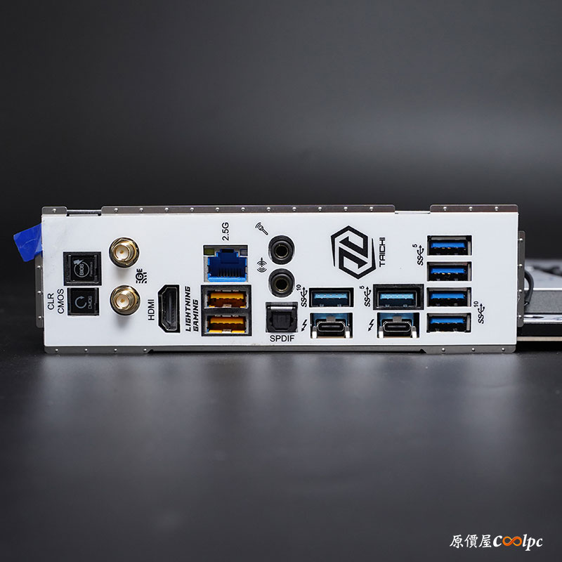 後方I/O介面已經預裝好白色擋板,上面有一層膜,安裝前務必將它撕下來!介面提供CMOS清除和BIOS Flashback按鈕、WIFI 6E無線網路+藍芽傳輸天線、HDMI 2.1、5個USB3.2 Gen2 (10Gbps) 介面其中兩個黃色是給電競鍵盤滑鼠使用、2.5GbE網路介面、Audio音效、光纖 SPDIF、3個USB 3.2 Gen1(5Gbps)、2個USB4 Type-C (40Gb/s)。