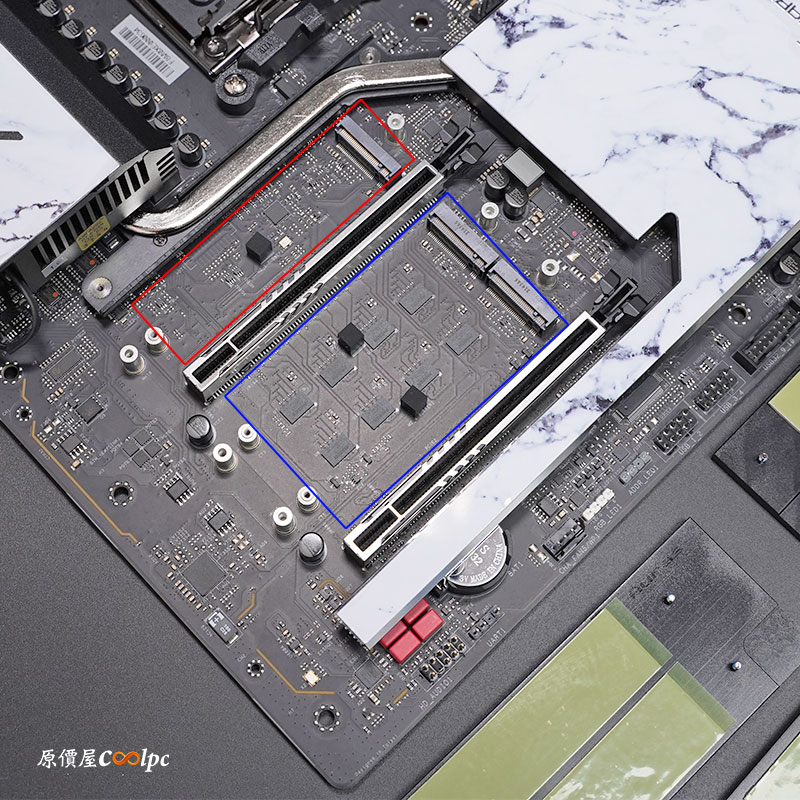 2個PCIe 5.0 x 16介面,皆採用強化裝甲設計,SMT表面黏著技術相較傳統的DIP針腳焊接方式,改善了訊號穩定性,並支援x16或x8/x8模式。