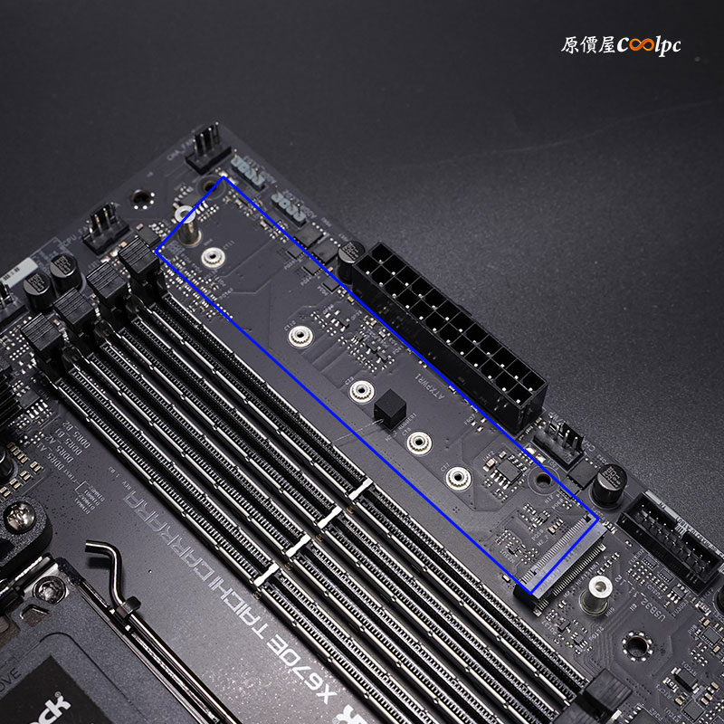 四個記憶體插槽為DDR5介面,支援雙通道技術,最大可安裝128GB容量,時脈最高可超頻到6600MHz,旁邊還有一個Gen3的M.2擴充插槽。另外第一次開機會需要一點時間,視記憶體容量決定開幾秒數,16GB x 2 為90秒、32GB x 2 為150秒、16GB x 4為170秒、32GB x 4為315秒,過了第一次開機之後,往後的開機速度都會非常快!往後如果主機板有重新刷BIOS或斷電,第一次都會比較久。