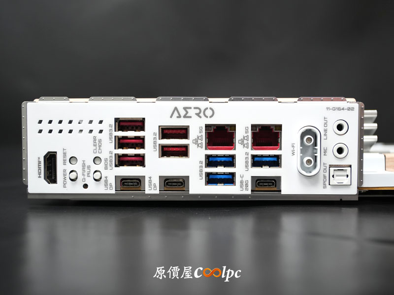 前置 I/O 共提供 HDMI、USB 20Gbps(Type-C)、 2 組 USB 10Gbps 擴充。同時可以看見 M.2 散熱片的末端都有一塊 AERO 皮革拉環,配合 M.2 EZ-Latch Click 與 M.2 EZ-Latch Plus 免螺絲快拆設計,不僅美觀,在 DIY 組裝上更省時省力。