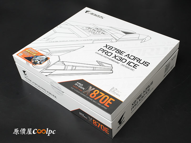 技嘉 X870E AORUS PRO X3D ICE 主板外盒完美展現了「ICE」系列專屬的冰雪質感。外盒採用極具現代感的純白色基調,並以黑灰線條勾勒出巨大的 AORUS 鷹神圖騰展現霸氣,側邊可以看見醒目的橘黑 X870E 晶片組標示,在黑與白的視覺衝擊下更顯層次感。