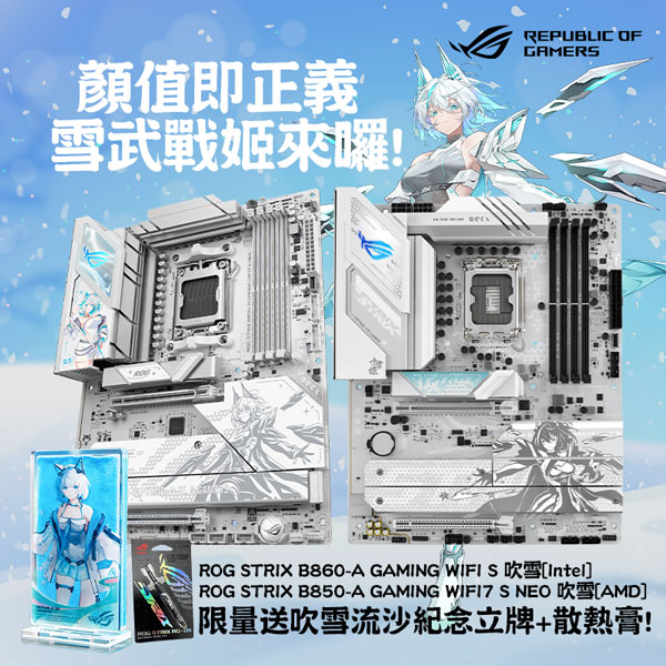 大家敲碗許久的吹雪系列終於正式引進台灣市場了!吹雪粉們,該上車啦!這次帶來的華碩 ROG STRIX B860-A GAMING WIFI S(Intel)和 ROG STRIX B850-A GAMING WIFI7 S NEO(AMD),這兩張吹雪主機板採用經典銀白配色,散熱裝甲上更精緻呈現二次元雪武戰姬圖騰,為純白主題機殼愛好者帶來絕佳視覺享受,造福 Intel & AMD 雙平台愛好者。現在來原價屋購買以上兩張吹雪系列主機板,除了搭 CPU 有優惠之外,還要加碼再送《吹雪》流沙紀念立牌與 ROG 散熱膏給你,活動數量有限,送完為止,有興趣的朋友快到全台原價屋門市或線上估價系統下單囉!