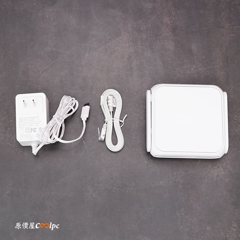 內容物有變壓器、扁式網路線、RT-BE58 Go 分享器本體;變壓器支援國際通用電壓 100-240V(50/60Hz),輸出 12V 2000mA,內附的網路線只有一米長度,另外使用手冊還有提供一組,預設 WiFi以及登入資訊,這資訊機身背後也會有,以防萬一的話可以拍照起來放在手機。