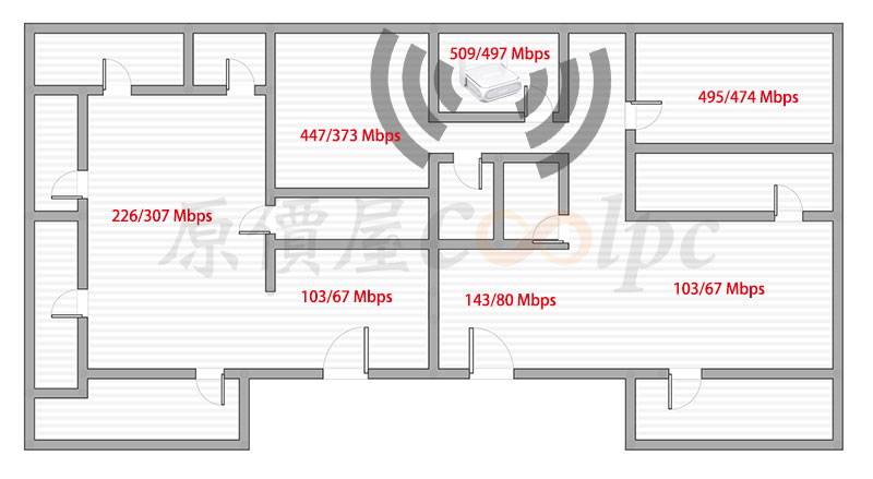 公司網路為中華電信雙向 500M,實測 WiFi 7 傳輸與訊號效率,靠近路由器的兩個房間可以接近滿載,隔間較遠會因環境或其他無線干擾,大大縮短傳輸效率,不過以雙天線的來說已經非常強大了,在同個空間使用,不會有訊號不佳的問題。