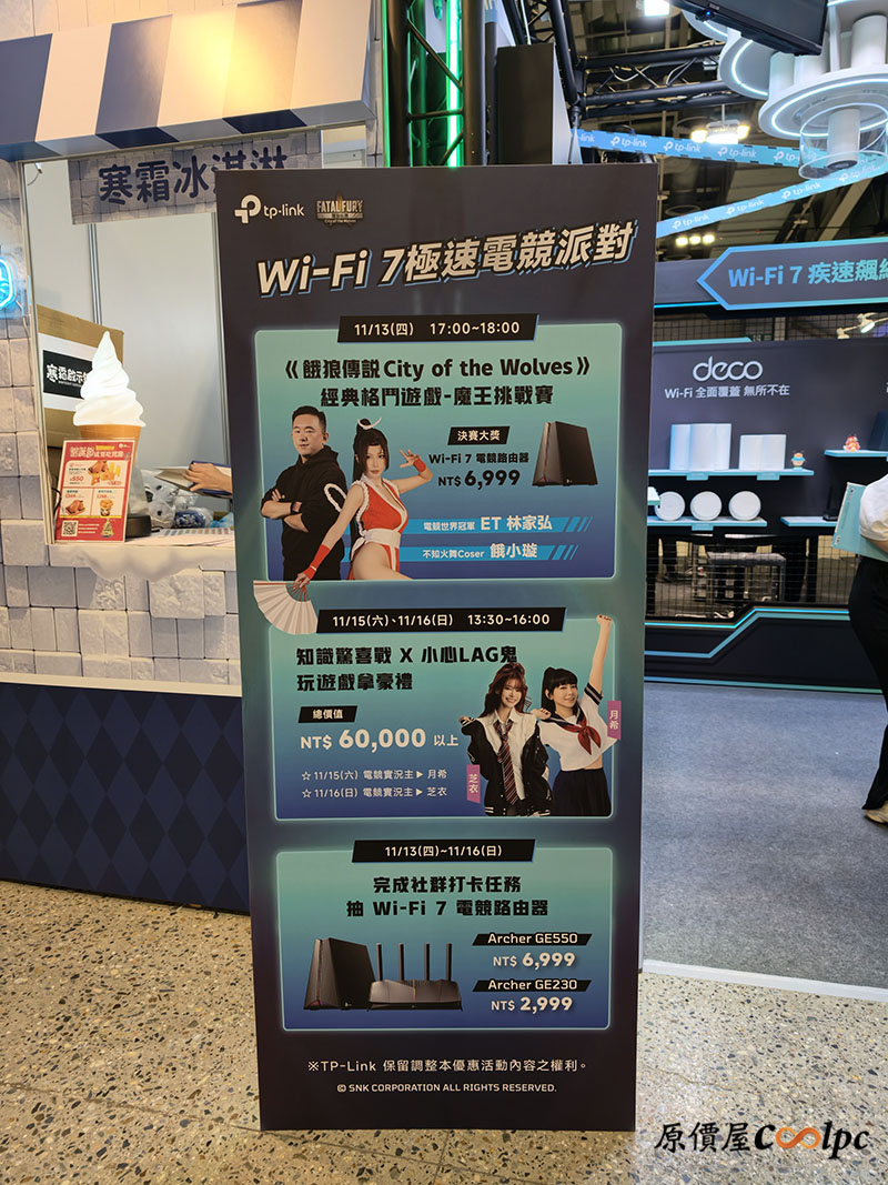 除了 TP-Link,原價屋這裡還有準備成堆成山的優惠好禮,都幫大家整理成懶人包了>>【懶人包】Wirforce 2025 Coolpc 超優惠促銷<<,看到喜歡的可要手腳快一點!逛展之餘,可別忘了到 TP-LINK 攤位看看!有不知火舞 Coser 餓小璇 和 世界電競冠軍 ET 林家弘 一起陪大家同樂!現場還有《餓狼傳說 City of the Wolves》魔王挑戰賽,挑戰關主就有機會把價值 NT$ 12,999 的 Wi-Fi 7 電競路由器帶回家,對自己有實力的玩家也請務必到攤位挑戰看看!