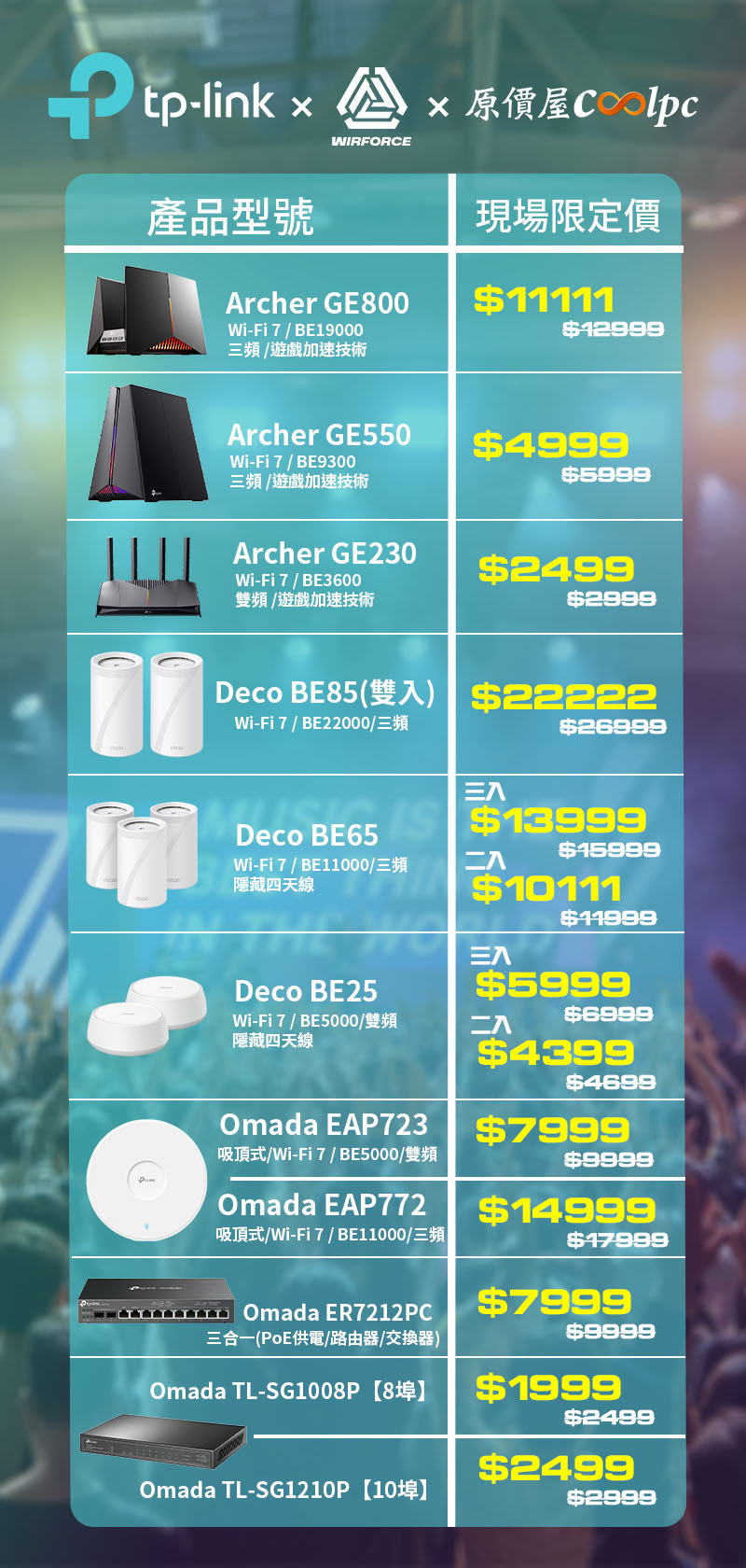 電競玩家一定不能錯過 Archer 系列!旗艦級的 GE800,從 $19,999 直降到 $11,111,Wi-Fi7 三頻加上遊戲專屬優化通道,延遲低到讓人懷疑是不是開掛~如果想要中階入手,GE550 只要 $4,999、GE230 只要 $2,499,造型帥氣、散熱夠力,打團不怕掉 Ping、連線不再看臉!除此之外還有像是覆蓋整屋訊號的旗艦王者 Deco BE85,原價 $26,999 直接殺到 $22,222;設定超簡單、穿牆力強的 Deco BE65 套組;超高 CP 主流選擇 Deco BE25 雙入組等也都是折了 $1000~$2000 不等。至於要穩定全辦公室或展場連線,EAP 吸頂式系列就派上用場,EAP723、EAP772 都支援 Wi-Fi7,訊號覆蓋廣又穩,現在現場價分別是 $7,999 與 $14,999,無論是咖啡廳、工作室還是活動現場,都能全域暢通。對了,若你想趁這個機會打造全屋最完整的網路系統,Omada ER7212PC 三合一路由器也來了,VPN、防火牆、PoE 電源全包,原價 $9,999,現場只要 $7,999!另外 TL-SG1008P 與 SG1210P 交換器也在特價,升級整個網路架構更輕鬆。!
