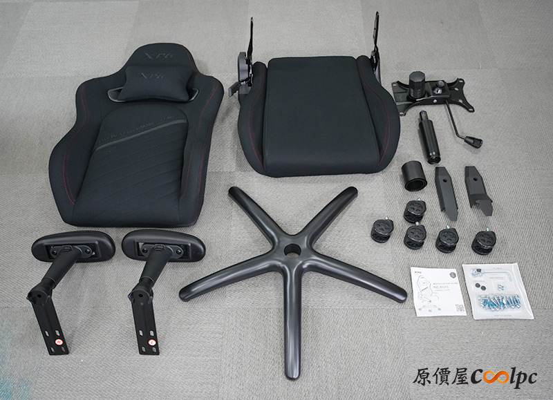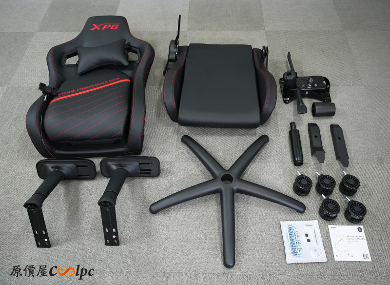 接著是XPG NEXUS電競椅,零件有椅背、坐墊、扶手、底盤、五星椅腳、CLASS 4氣壓棒、氣壓棒套筒、腳輪、側護蓋、螺絲包、說明書,內容和NEXUS PLUS相同,不過椅子面料和機構設計就有不同了。