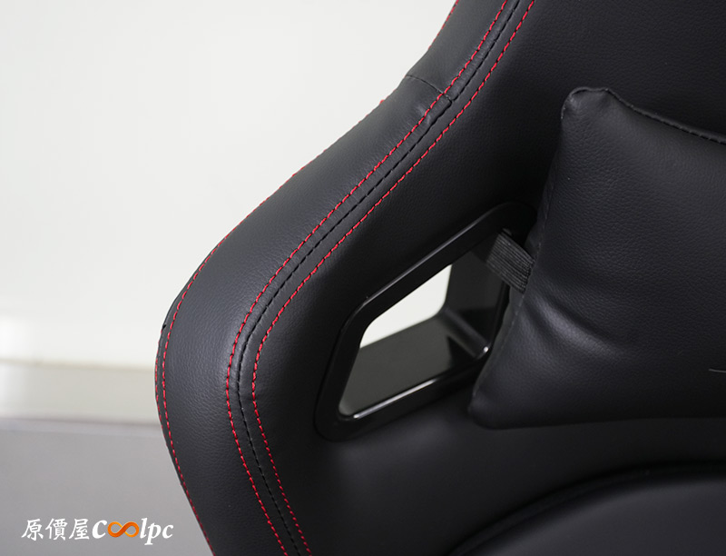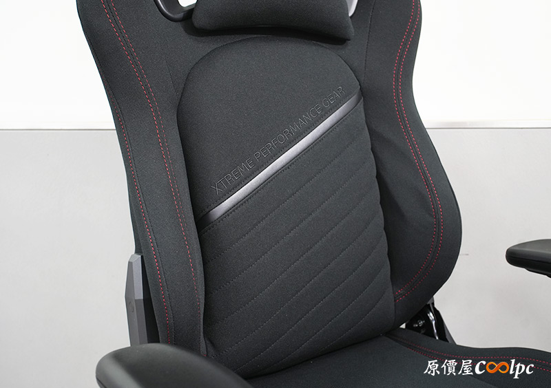 椅背特別凸起貼合脊椎曲線,表面縫上XTREME PERFORMANCE GEAR字樣,還有車縫線與一道紅色皮革做綴飾,讓椅面更添設計感。