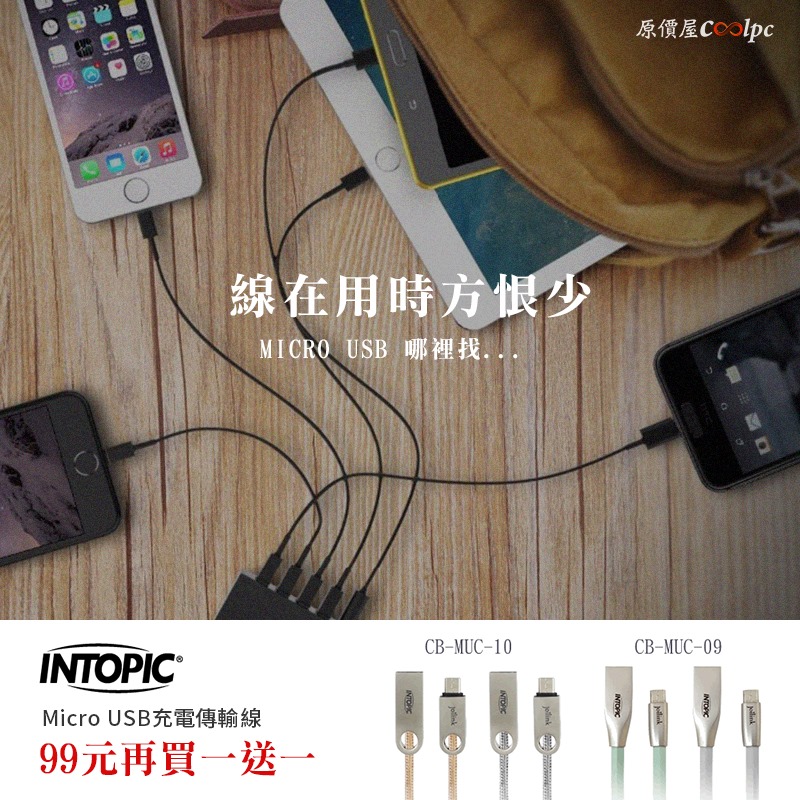 99元吃到飽都不稀奇了,那我們就再買一送一吧!改朝換代就是要撿便宜的時候了,雖然TYPE-C介面來臨,但MicroUSB充電孔的設備其實依然普遍啊…..。現在99元就可以買到2條有鋅接頭編織線(CB-MUC-10)或是扁線(CB-MUC-09)的Micro USB充電傳輸線,等於50元銅板價買一條有備無患,實在沒什麼好說的了!INTOPIC 廣鼎 Micro USB充電傳輸線前端的鋅合金還滿好看的,線長120cm相當足夠,不易纏繞柔軟編織布線,或扁現款是菱形TPE抗纏繞設計,接頭處耐彎折加強設計,有耐拔插次數5000次以上!