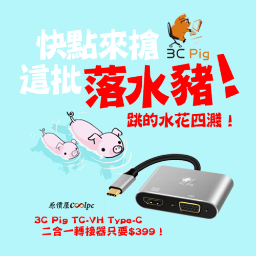 快點來搶這批落水豬!3C Pig跳的水花四濺 TC-VH Type-C二合一轉接器半價啦 !