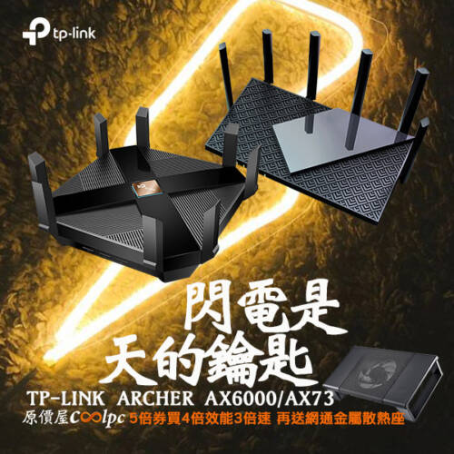 5倍券買4倍效能3倍速的TP-LINK AX6000/AX73頂級分享器,再送網通金屬散熱座!