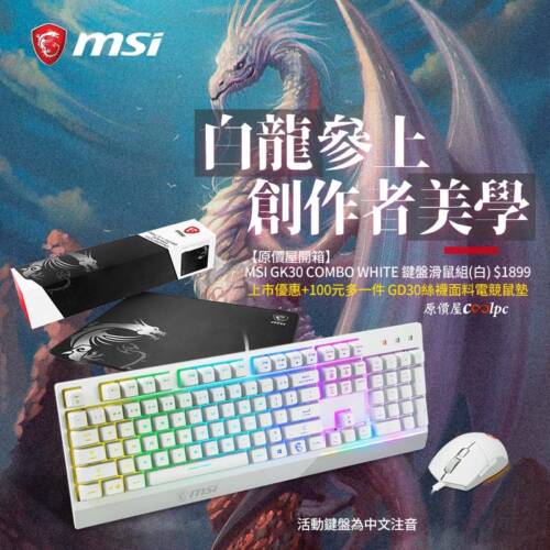【新品優惠+開箱】創作美學新白龍登場!MSI VIGOR GK30 Combo White 鍵盤滑鼠組!