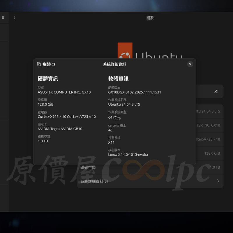 開箱的 Ascent GX10 是 1TB 的版本,預先安裝好 NVIDIA DGX 系統(Ubuntu 24 Linux)。
