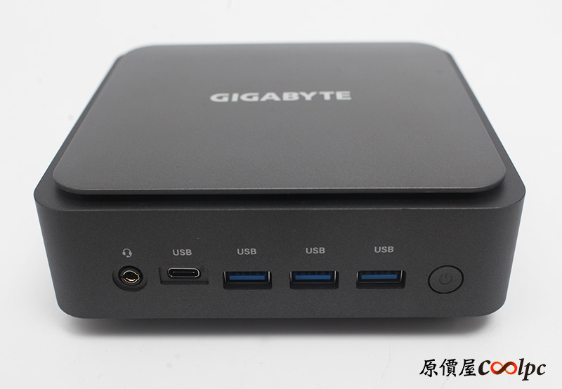 主角登場!尺寸僅有52×134.2×139.1mm,就連午餐的便當盒都比它大,但這裡面可是塞了一台電腦呢!四邊圓角設計,頂部是鐵灰色為底在搭配銀色GIGABYTE字樣,周遭則是深灰配色。