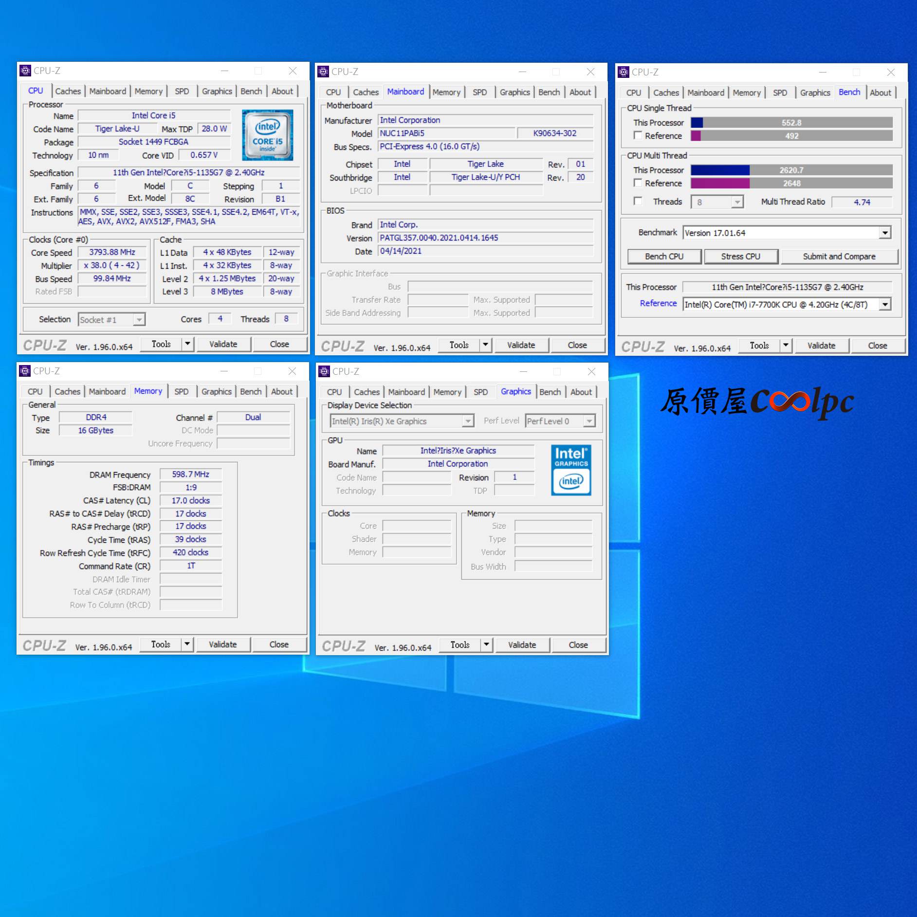 安裝好記憶體、硬碟,灌好系統後,緊接著就是實際測試啦!首先使用CPU-Z可以看到這台i5 NUC 規格為11代的i5-1135G7 4核/8緒處理器,匯流排通道為PCIe 4.0,顯示晶片為Iris Xe,處理器效能表現可以說和Intel自家i7-7700K相同!