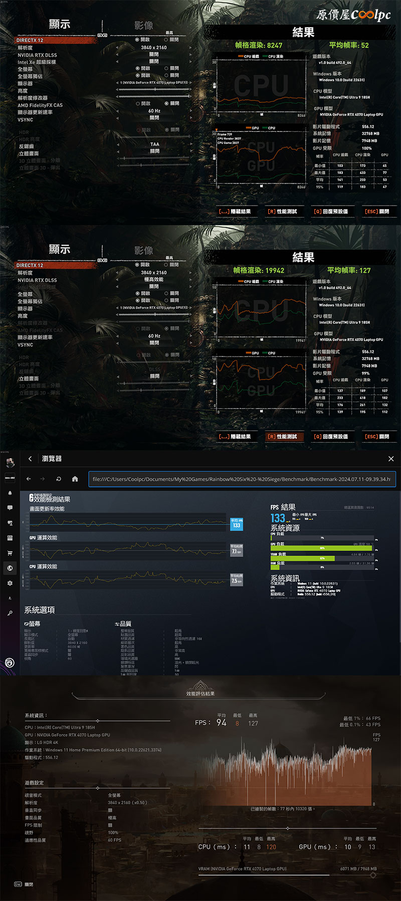 NVIDIA GeForce RTX 4070 Laptop 8GB 獨立顯卡表現還不錯!跑了古墓奇兵 暗影、虹彩六號:圍攻行動、刺客教條 幻象,4K 效能全開最低 52 fps,最高都有 100 fps + 水準!最嚴苛的Cyberpunk 2077 僅只有2K 能夠穩 60 fps,開光追+DLSS 3 也都有 74 fps!