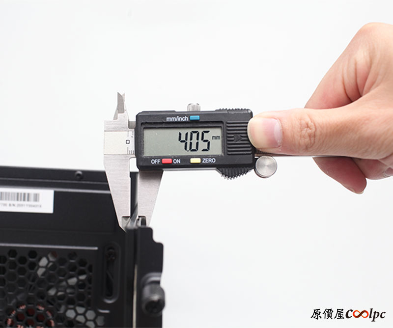 整個機殼最適合安裝水冷的位置就是前方,因為風扇內外兩側都能安裝,如果要把空間極大化就是將風扇安裝在外側,這樣內側就有非常充裕的空間可以放冷排,也比較不會因為裝了水冷而壓縮顯示卡的空間。實際丈量前方預留的位置,大約還有6公分可以放冷排,不過官方建議冷排盡量壓在5.5cm內,大概是想保留至少35cm給顯示卡,摁…可以理解。