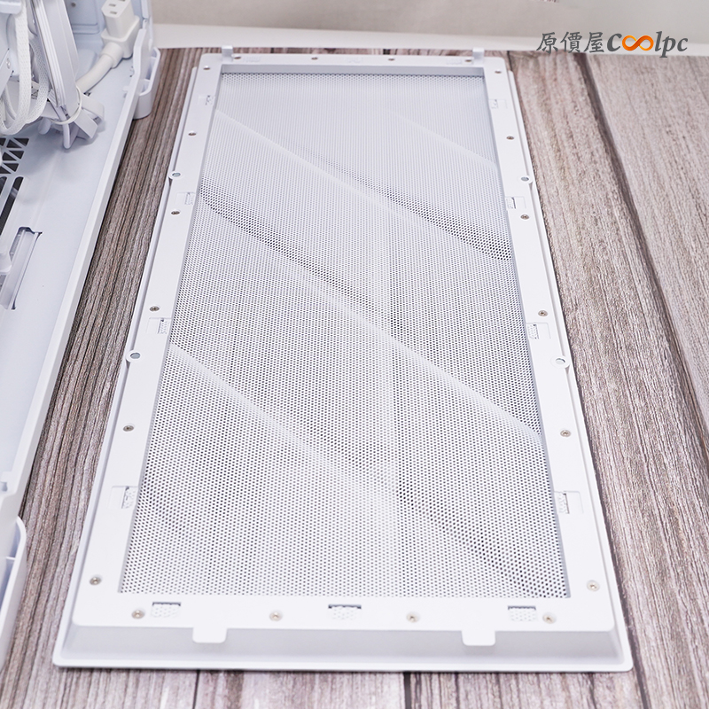 前面板採用磁吸式設計,上方和下方有兩個 PIN 腳來固定面板,立體造型的通風遮罩也看得一清二楚。