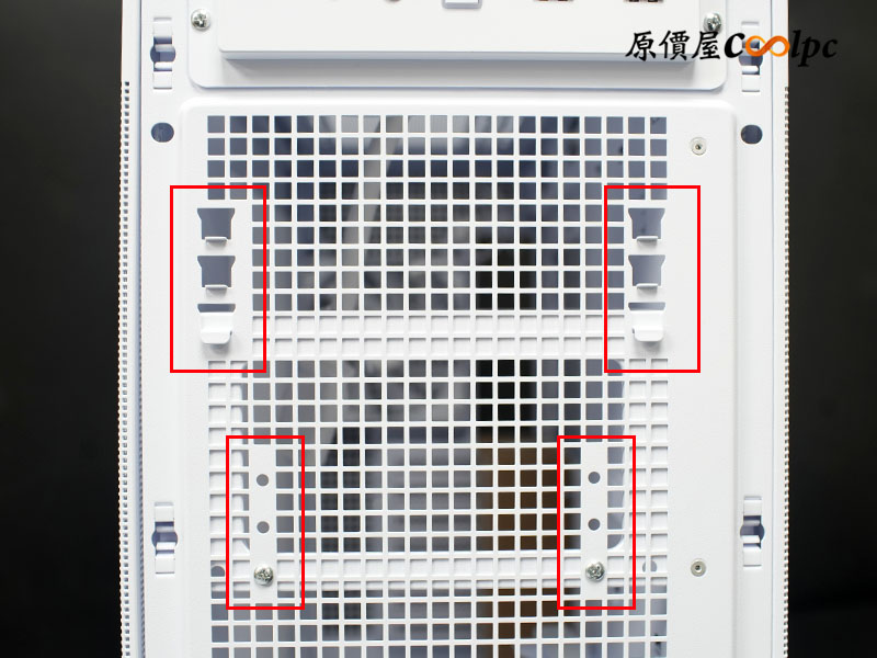 下層採用大面積方格透氣設計,電源承襲 AP201 的前置安裝配置;紅框處為三段電源支架安裝鎖點,用來靈活對應不同長度的電源供應器。