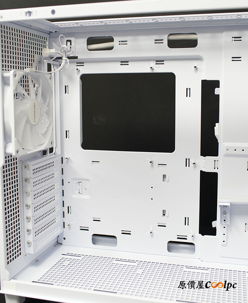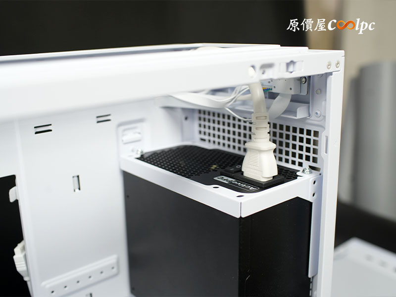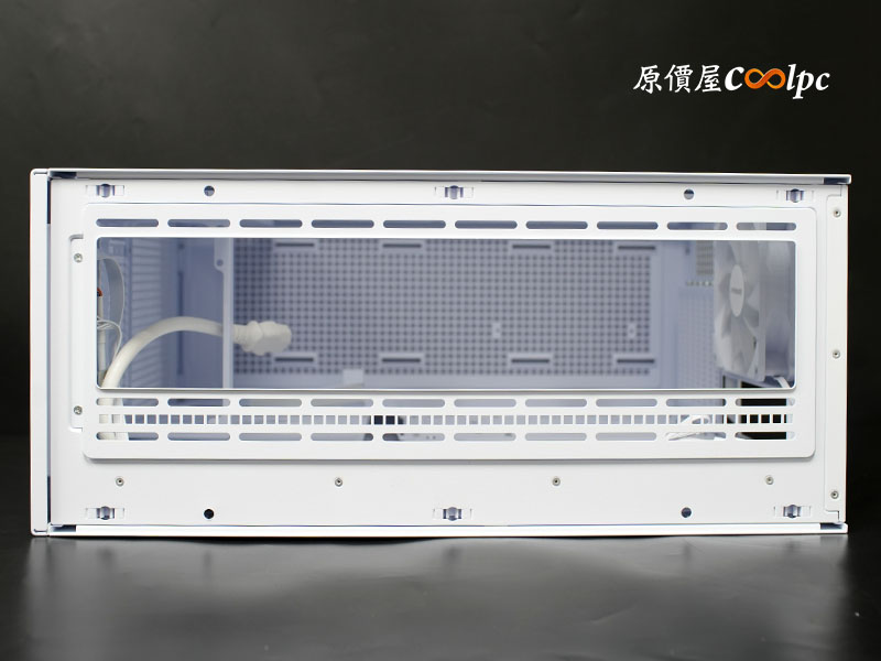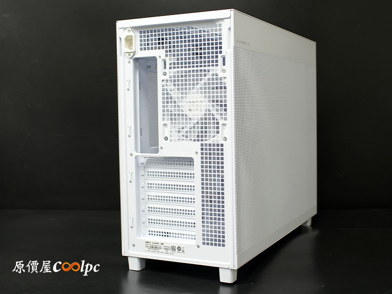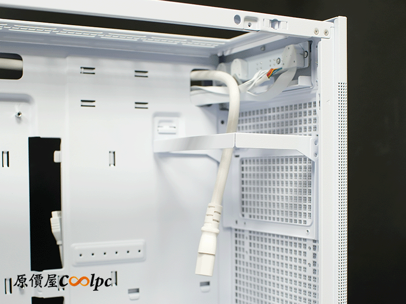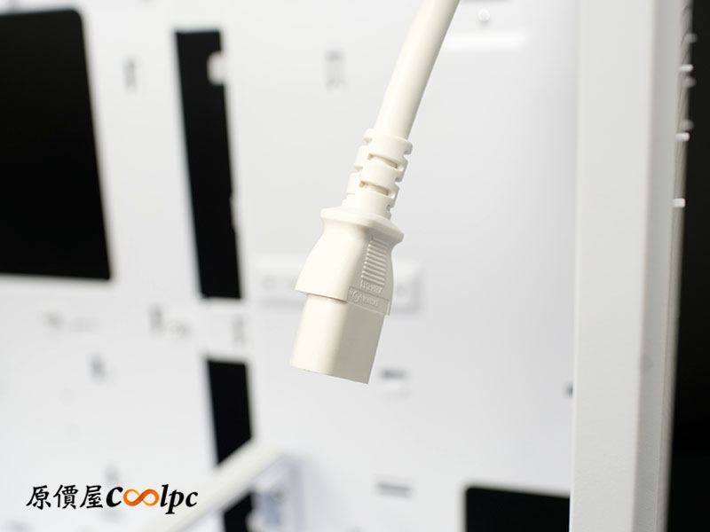 後方維持大面積方形孔設計讓排氣順暢;POWER CORD連接孔位於左上角,一路延伸到前置電源的位子。