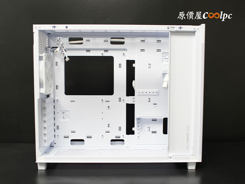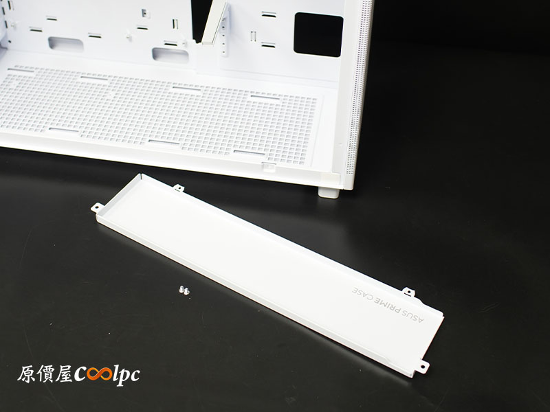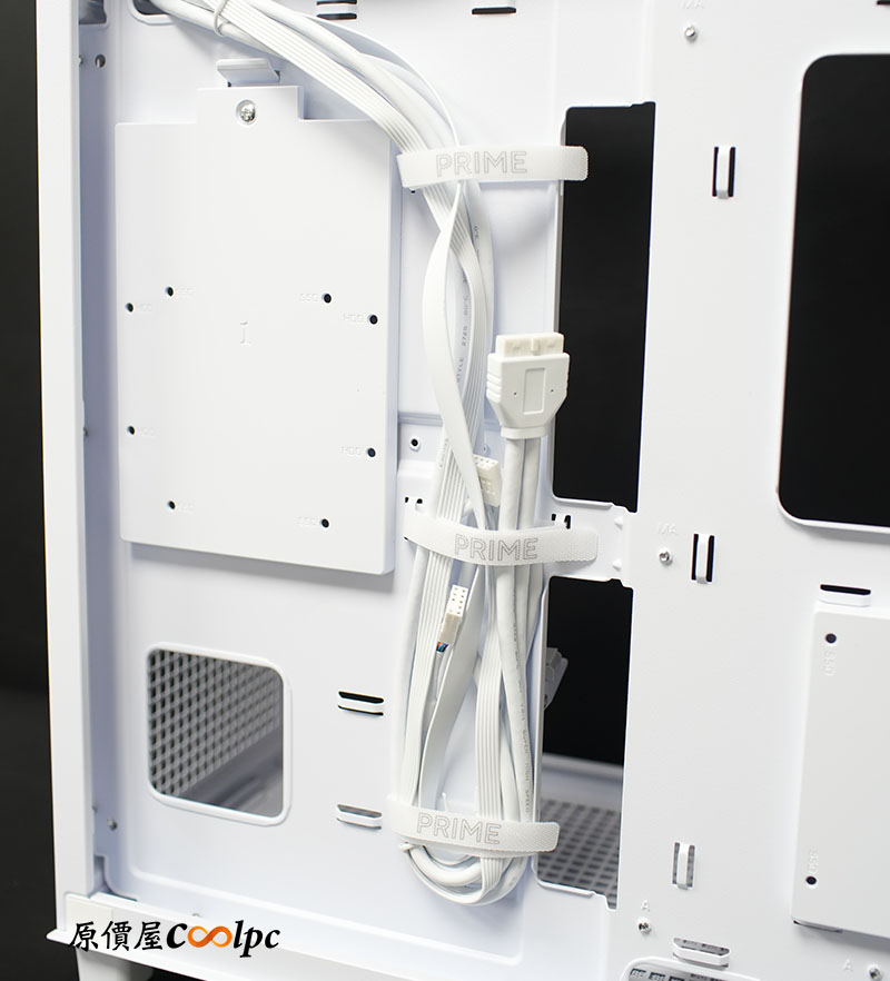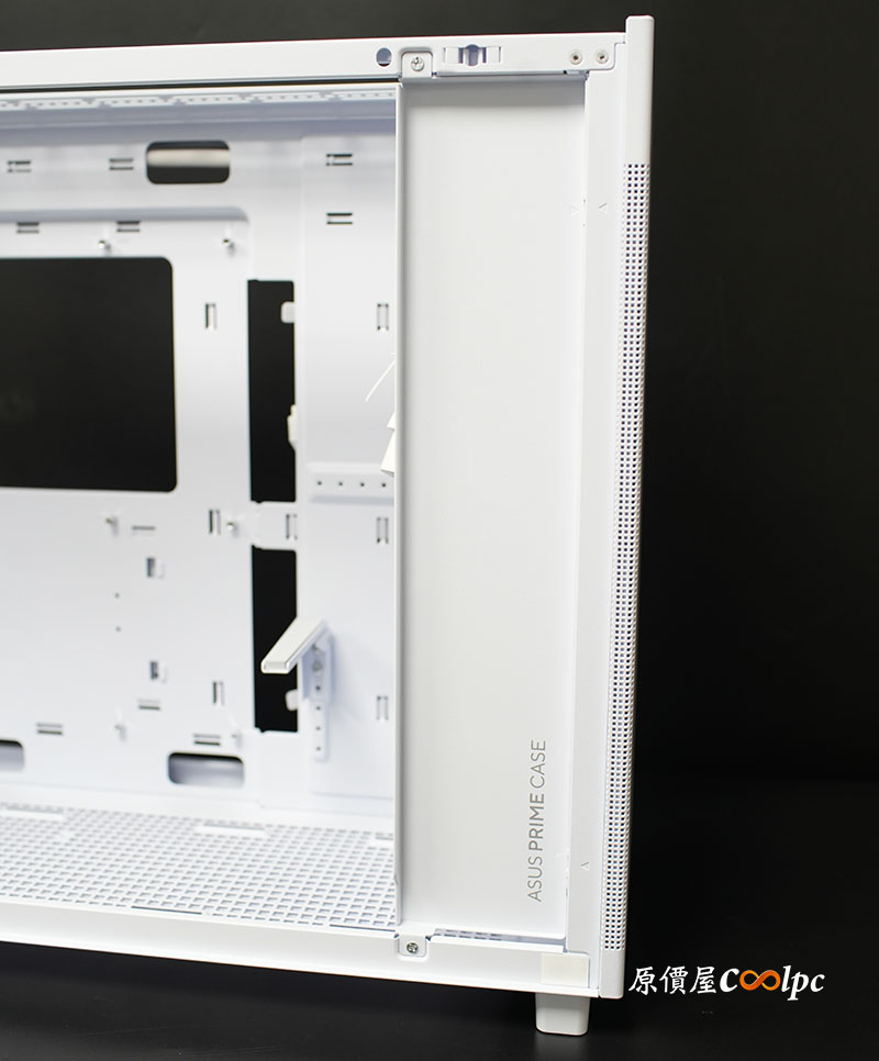 電源倉旁設有可拆卸式理線板,除了在裝機時提供更寬裕的操作空間,最重要的是幫你把亂糟糟的現藏起來~ 角落精緻的 ASUS PRIME CASE 字樣更增添了視覺感。