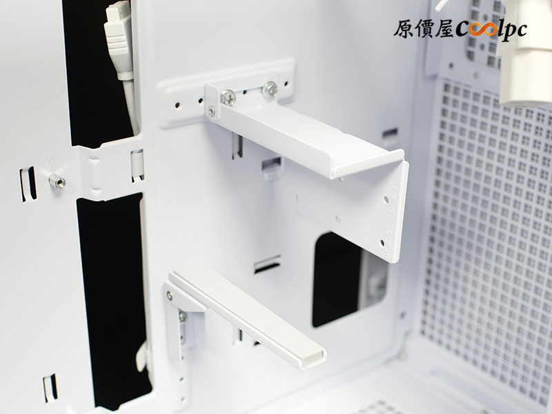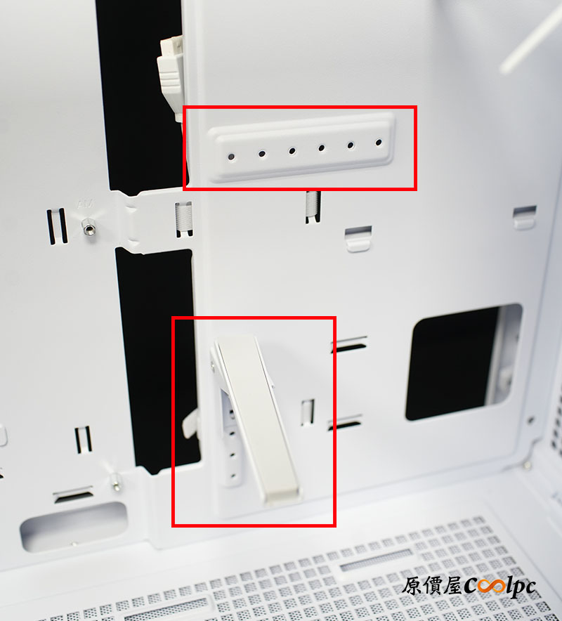 各位玩家最關心的顯卡支撐架這回也有加進來!而且還是透過整排螺絲孔鎖定的多段式堅固支架,頂端還貼心地包了防滑墊,讓心愛的顯卡絕對不刮傷。上面一排螺絲孔則是給隨附的 RTX50 系列顯卡支架安裝的鎖點,如果你現在是用舊顯卡,那這排孔位可能還用不到。