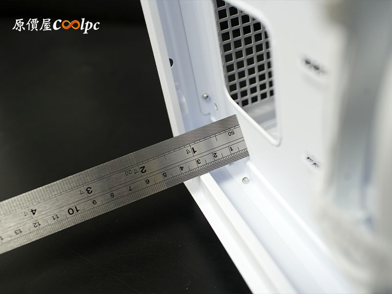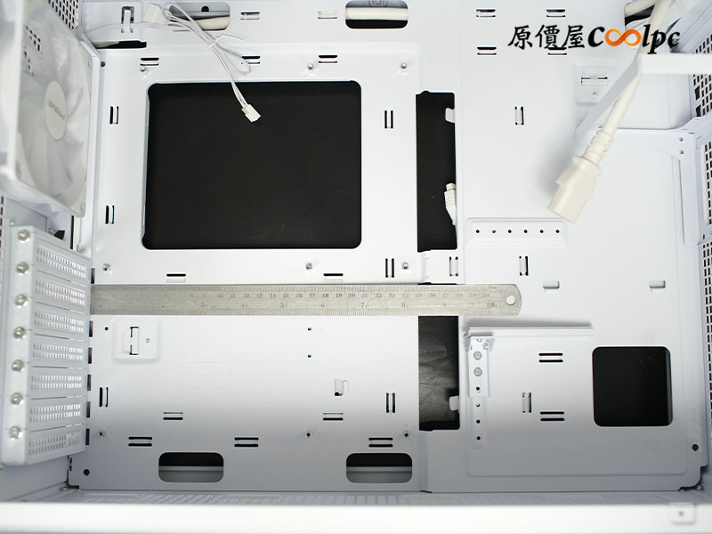 背板理線空間給得非常大方,足足有 3.4cm 寬!配合現在主流的模組化電源,就算把線全部集中在中央凹槽,空間還是綽綽有餘。