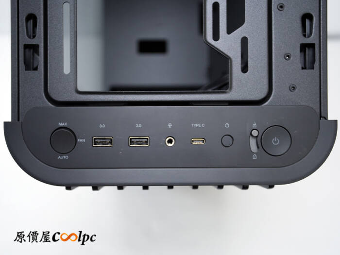 I/O 從左到右提供風扇控制鈕、2*USB 3.2 Gen1、3.5mm音源孔、USB 3.2 Gen 2×2 Type C、重開機鍵、電源鍵。