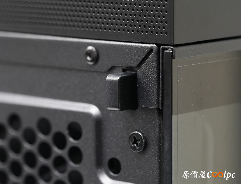 左右側板用卡榫固定,在機殼後方設有按鈕能夠開啟,關閉則只要將側板推入就可以囉。