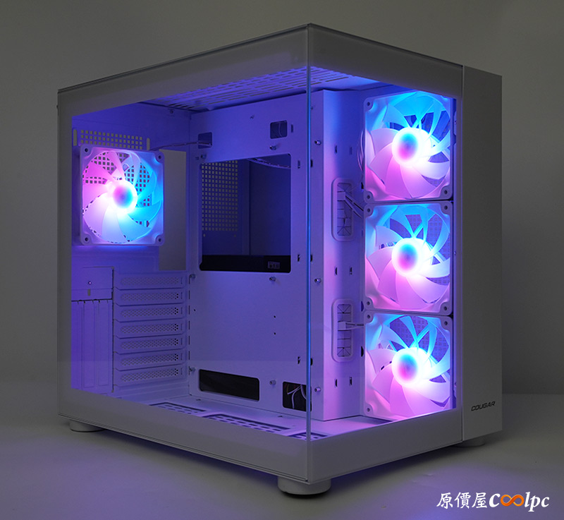 雙艙體結構加上海景房格局,COUGAR FV150 RGB結合DIY機殼兩大流行元素,唯一可惜的就是不支援背插主機板,但這並不改變它是一款好殼的事實。簡單回顧一下COUGAR FV150 RGB機殼的重點,雙面玻璃無立柱設計,視野寬廣無死角,搭配雙艙體讓內部零件整齊有序,最大可裝ATX規格主機板,360mm水冷散熱器,CPU高度限制180mm,顯卡長度可達400mm,電源長度210mm,大型零件基本上能夠通吃了,而且內建4顆120mm ARGB風扇(側3後1),側邊還是結合觀賞性與實用性的反葉風扇,另外機殼上、下都有風扇擴充空間,正常安裝的情況下最多可裝10顆風扇,散熱絕對不是問題。其他像是燈光控制器也直接附上,還能支援顯卡垂直安裝(須自備PCIe延長線),機殼I/O提供USB Type-C連接埠等,功能可說是一應具全。售價方面也很棒,像今天開箱的COUGAR FV150 RGB白色版只要$2390元,以這類型的機殼來說性價比相當高,有興趣的朋友歡迎透過原價屋各大通路購買唷。