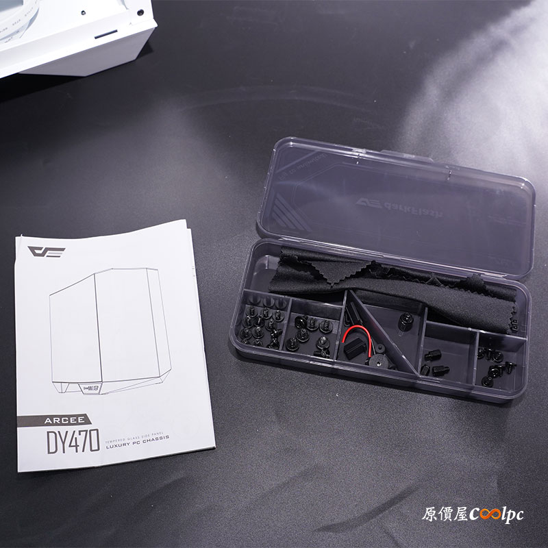 配件有機殼使用說明書和螺絲配件盒,是說都幫你把螺絲分開,而且還有擦拭布讓你可以擦拭機殼。