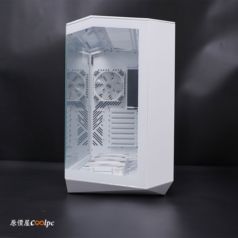 這次開箱 DY470 機殼是白色款式,也是目前最夯的海景房,外觀採不規則切角設計,如同鑽石般切割,正面看的話相當明顯,側面和後面就跟一般機殼造型一樣,前、側面和上方為鋼化玻璃,後面則是雙透孔散熱鋼板,進出風方式就是由側面進,上方和後方出來對流;背後底下還有一個抽取式防塵網,記得定期拿出來清洗。