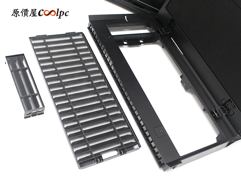 底部4顆增高腳座,並有防震防滑軟墊設計,抽掉原先的快拆式防塵濾網後,底部則是超大面積的進氣口,你看這軌道設計就知道,他不僅能鎖硬碟架,還能選擇安裝2顆120/140mm風扇,或280mm水冷排!